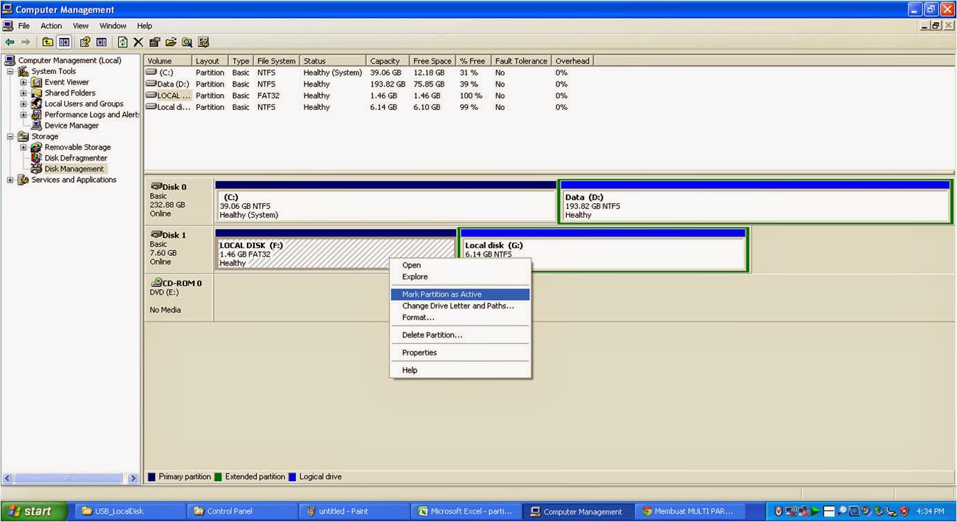 22. Untuk membuat partition system pada salah satu partition flashdisk maka klik kanan salah satu partition kemudian pilih Mark Partition as Active.